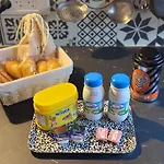 The kitchen amenities at La Grange Villa feature tea and coffee making facilities, a refrigerator, and glassware, provided in an outdoor dining area.